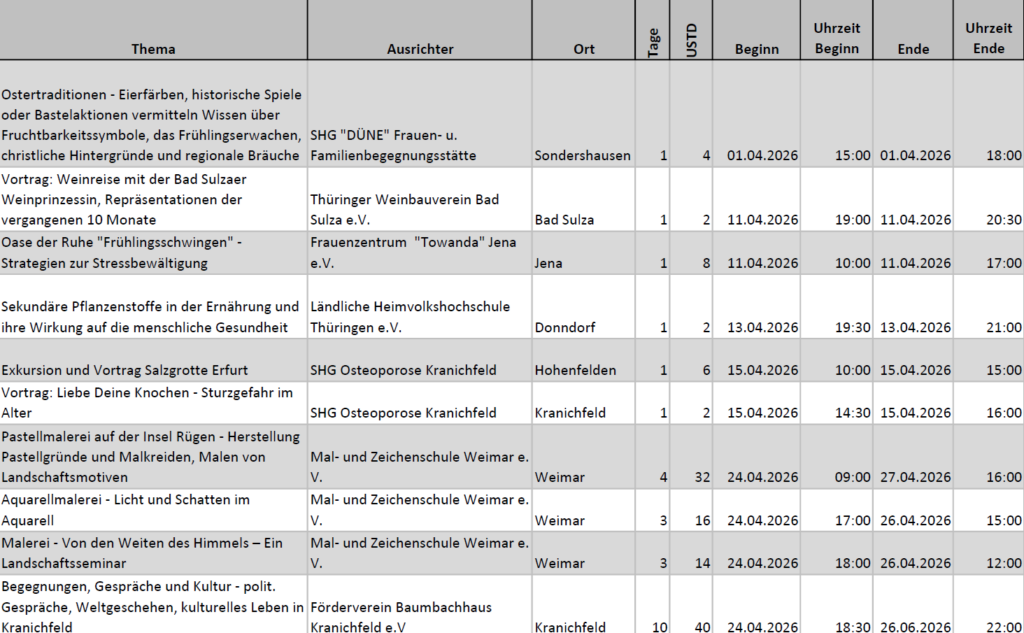 Hier finden Sie eine Übersicht der nächsten Veranstaltungen und Kurse, die wir gemeinsam mit unseren Kooperationspartnern in Thüringen anbieten: Region Mitte April / Mai für die Städte und Kreise:Erfurt, Weimar, JenaSaale-Holzland-KreisSaalfeld-RudolstadtIlmkreisKyffhäuserkreisSömmerdaWeimarer Land Region Nord April / Mai für die Städte und Kreise:EichsfeldUnstrut-Hainich-KreisNordhausen Region Süd April / Mai für die Städte und Kreise:SuhlSchmalkalden-MeinigenHildburghausen Sonneberg Region Ost April / Mai für die Städte und Kreise:GeraAltenburger LandGreizSaale-Orla-Kreis